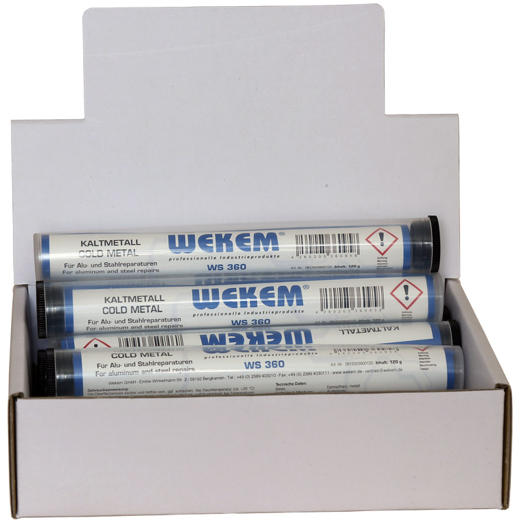 The cold metal is suitable for fast and highly resistant repairs, maintenance works and bondings of metal parts. It can also be used as repair compound in the entire industrial area. You can just cut off the required amount, knead it and process it. It is resistant against alcohol, ester, salt water, oil, fuel and most acids and lyes. The cold metal does not contain any solvents so that it cures practically without shrinking. It can then be mechanically worked on (drilling, filing, milling) without any problems and painted over without pre-treatment.