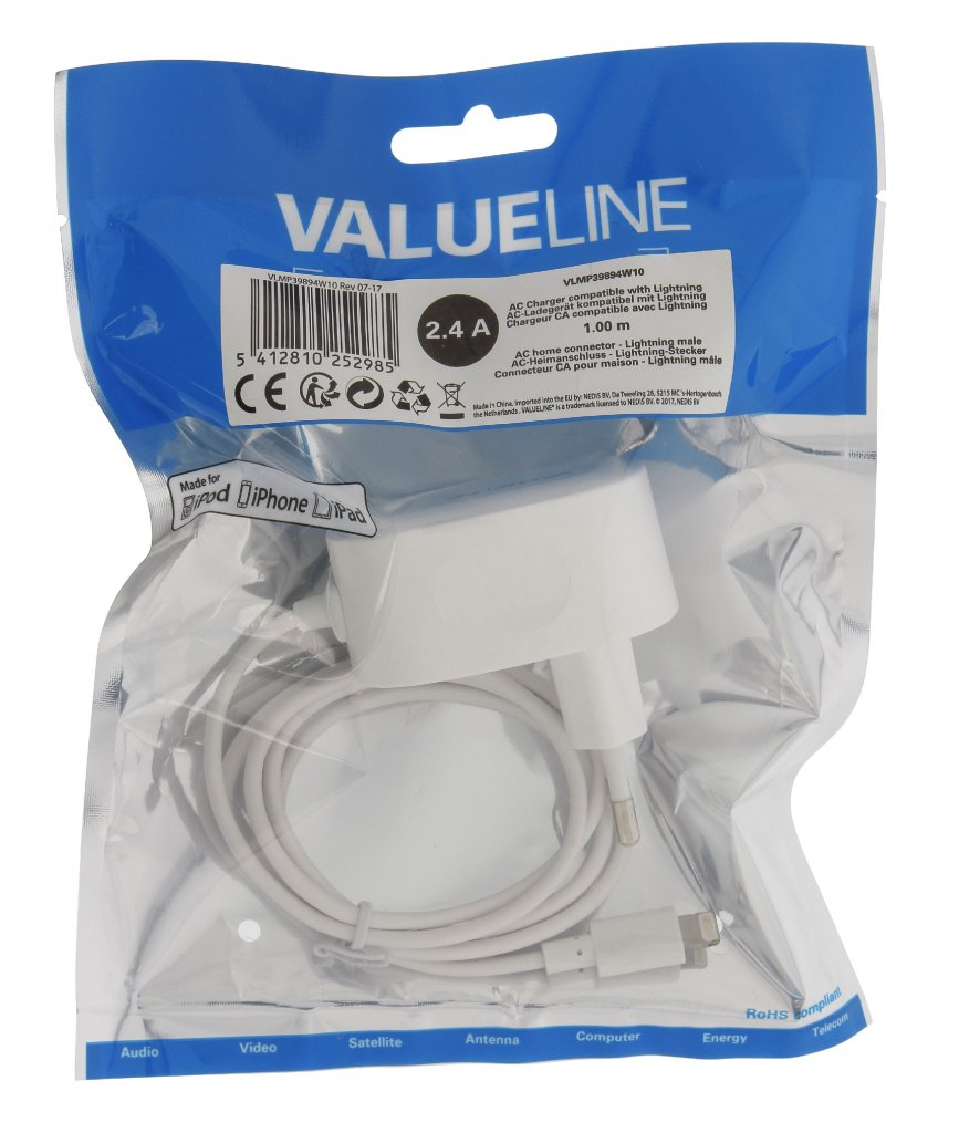 Väggladdare, 1 utgång, 2.4 A, IPHONE / APPLE, Vit, (Valueline)