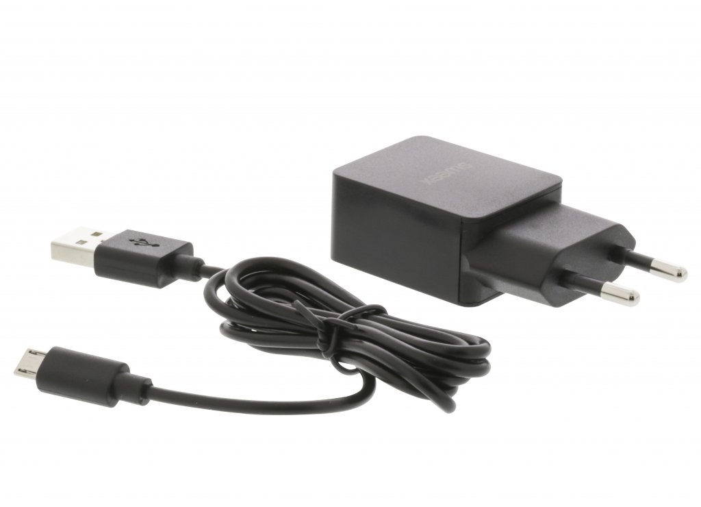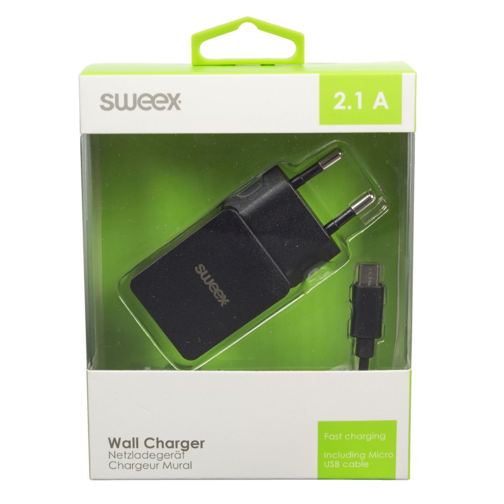 Väggladdare, 1 utgångar, 2.1 A, micro USB, Svart, (Sweex)