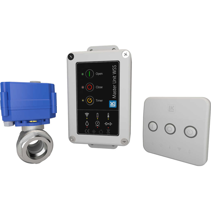 LK Startpaket WSS innehåller en huvudenhet, en motorventil G20 eller G25 och en manöverpanel. Motorventilen monteras på inkommande vatten efter vattenmätaren och styrs av huvudenheten. Huvudenheten spänningsmatas med en 12V nätadapter. Med manöverpanelen kan man stänga av vattnet direkt eller med fördröjning och slå på det igen. Manöverpanelen kommunicerar trådlöst eller med kabel och drivs antingen med batteri eller med extern spänningsmatning. Det går att komplettera systemet med LK Läckagedetektor WSS om man vill att vattnet stängs av om ett läckage detekteras. Totalt kan max 16 manöverpaneler eller läckagedetektorer anslutas till huvudenheten.