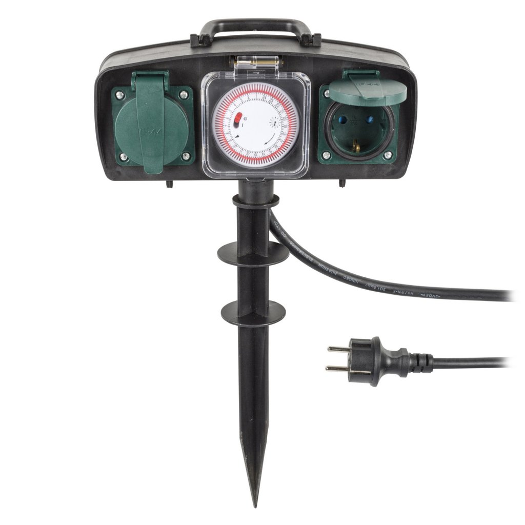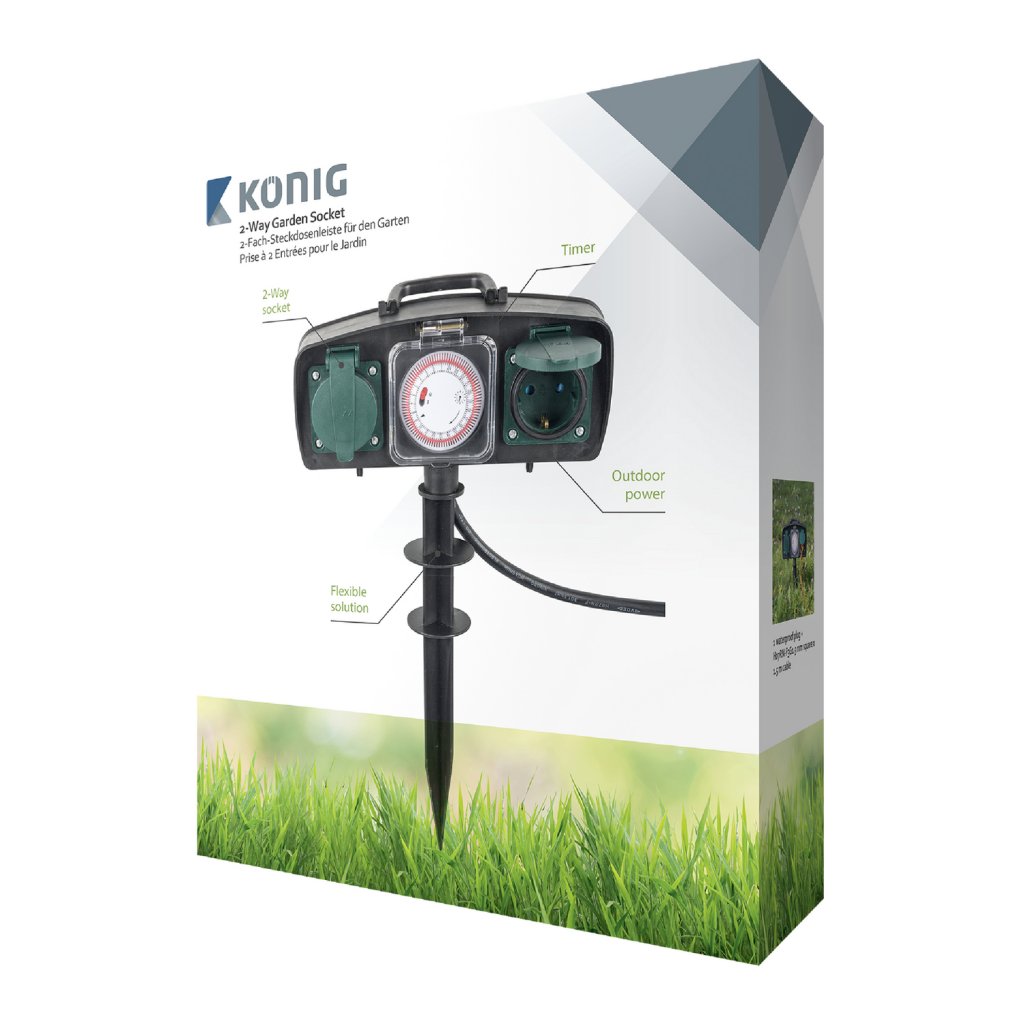 König 2-vägs förlängningsuttag för användning utomhus med timer ger en flexibel lösning för julbelysning eller trädgårdsutrustning. En kabellängd på 1,5 m, ett handtag på ovansidan och ett jordstift gör att du kan placera utomhusuttaget nästan överallt.