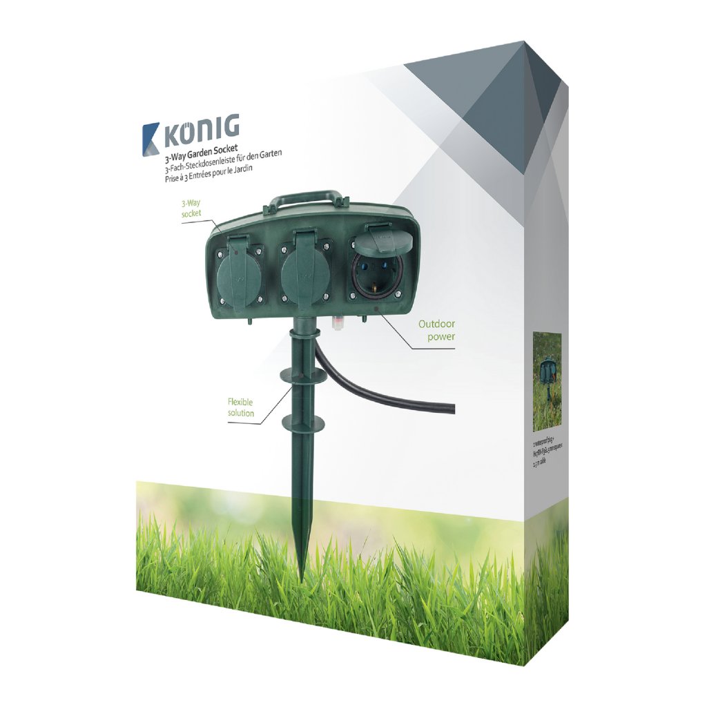König 3-vägs förlängningsuttag för användning utomhus ger en flexibel lösning för julbelysning eller trädgårdsutrustning. En kabellängd på 1,5 m, ett handtag på ovansidan och ett jordstift gör att du kan placera utomhusuttaget nästan överallt.